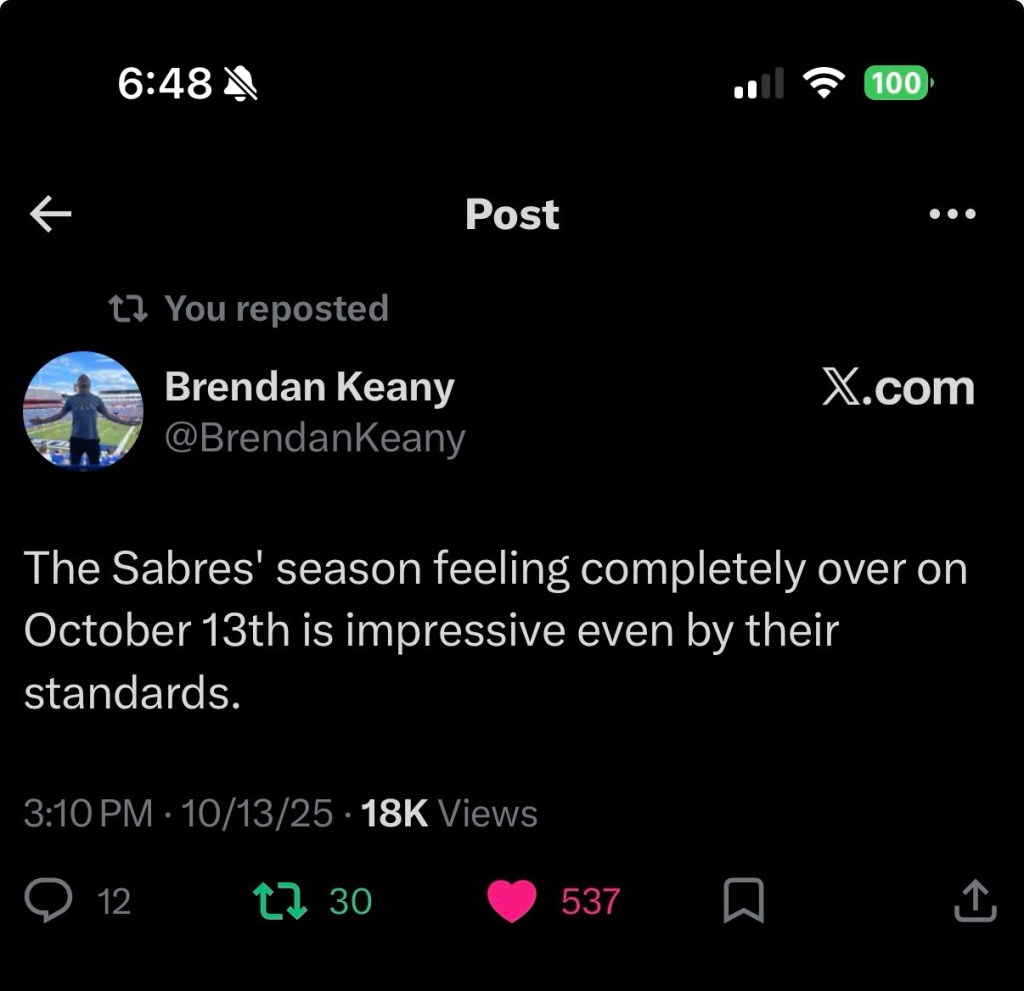 This was moments after the Sabres dropped a 3-1 decision to the Colorado Avalanche in an afternoon home tilt on Columbus / Indigenous People’s / Italian-American Heritage Day (pick your own name for it). There’s no shame in losing to the Avalanche; they’re the odds-on favorite to win it all this year. However, the Sabres looked like a mess; they’d been outscored 10-2 in their three losses to that point, and those games never really felt competitive.